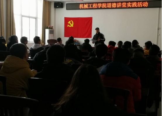 活动开始由主持人徐一刚分别对本次“道德讲堂”活动意义进行了讲解,并讲说了活动流程。活动第一项是“向德鞠躬”,由徐一刚带领在场学生向道德牌鞠躬致敬,在场同学每个都神情严肃,认真对待。随后,进行活动第二项,在场学生一起观看有关学模范,做善事的视频,视频观看完毕,同学们各抒己见,积极发表自己的感触。紧接着,活动第三项是由李毅同学带领大家一起朗诵《弟子规》,一起感悟圣人的教诲,讲“道”与“德”落实到生活中的一言一行中。然后,活动进行第四项,由闫青同学为在场同学讲述了一个关于道德的小故事,让我们明白了美德寓于故事之中,道德却寓于行动之中,我们要从身边做起,从小事做起。接着,活动第五项,由在场同学在纸片上写下自己的祝福语,依次贴在祝福板上。活动最后一项,播放《学习雷锋好榜样》的歌曲,全体一起合唱。本次活动在歌声中圆满结束。