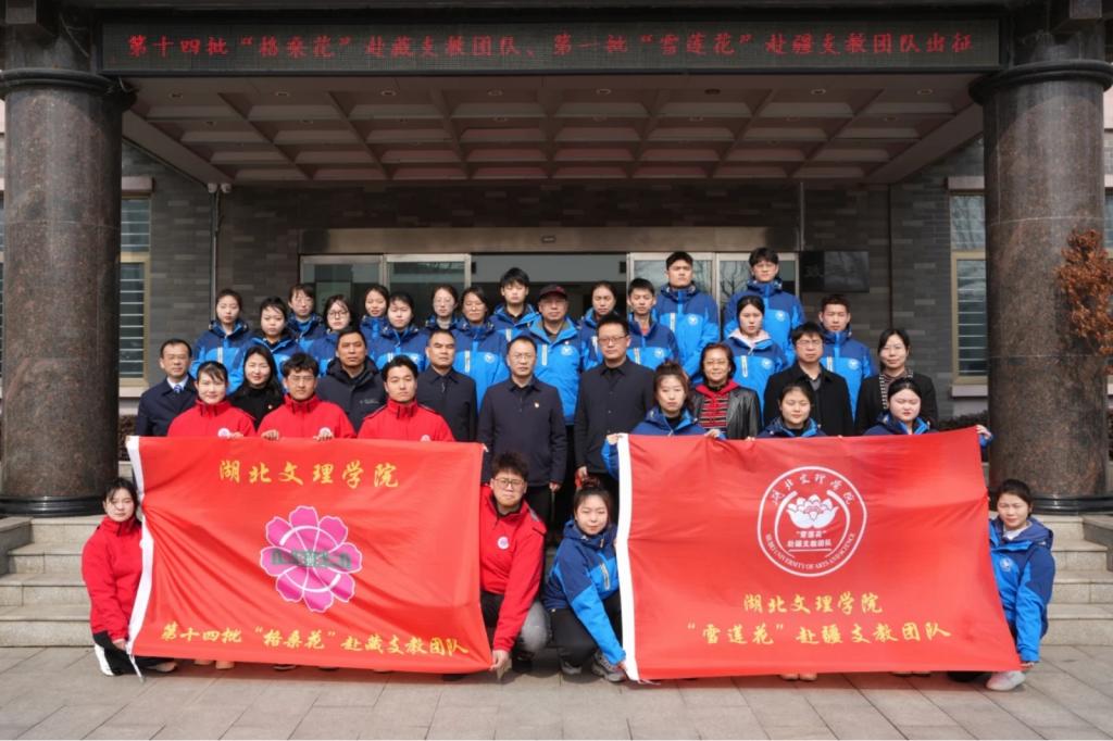 (机械通讯员赵兆钧)2月24日上午,湖北文理学院第十四批“格桑花”赴藏支教团队、第一批“雪莲花”赴疆支教团队出征仪式在行政楼报告厅举行。我院党委书记詹玉刚,党委副书记王超,辅导员赵兆钧,学生代表“格桑花”赴藏支教团队队员王育帅,“雪莲花”赴疆支教团队队员王谦出席本次出征仪式。