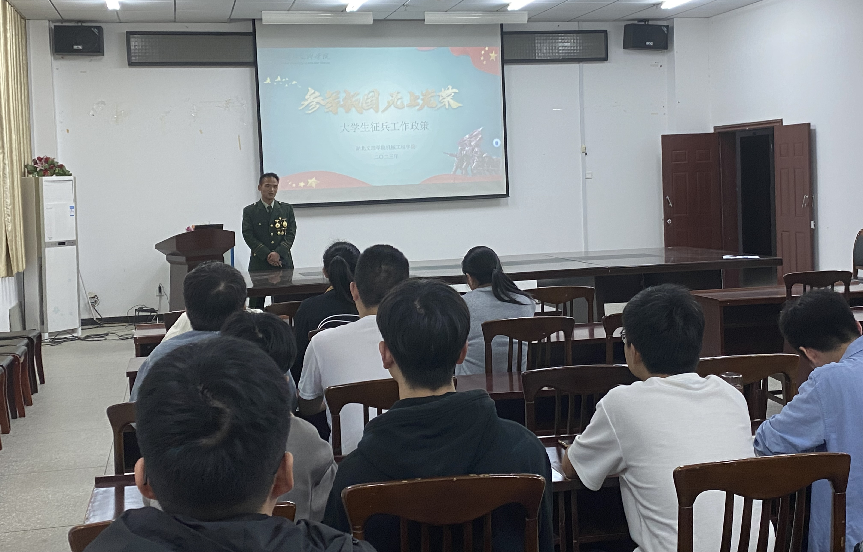 (通讯员王政)青春只有一次,参军无上光荣。为深入贯彻习近平强军思想,进一步激发大学生的参军热情,帮助同学们了解大学生参军入伍相关事宜,鼓励青年大学生积极投身国防建设。5月23日晚上6点30分在工科楼GW-409会议室,开展“参军报国 无上光荣”国防教育征兵宣讲,本次宣讲由退役军人吴碧栓老师主持,各年级学生和退役军人代表参加了宣讲会。