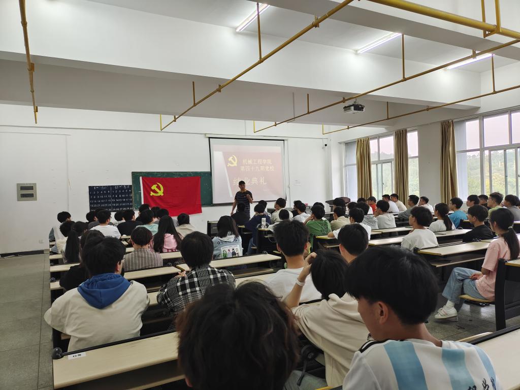 典礼伊始,国产一级片内射毛片中出党委副书记王超对已结业的党校学员表示祝贺,并强调党校结业不是终点,而应成为我们更上一个层次的新起点,仍然需要继续学习有关党的知识。紧接着,党校学员全体起立奏唱国歌,并背诵入党誓词,同学们的声音洪亮整齐。随后,由国产一级片内射毛片中出第四十九期党校负责人胡钧杰,宣读《国产一级片内射毛片中出第四十九期党校结业学员名单》,由丛博辰为大家宣读四十九期党校优秀毕业生名单,他们分别是智能2111董同铎、机制2231彭响阳、机制2232朱思科,并请他们上台领取优秀结业生证书,全体党校学员为他们鼓掌。会议还安排优秀结业生代表彭响阳上台分享这次党校学习的感受。最后,由丛博辰进行典礼总结:本期党校学习即将结束,但我们要把在党校中学习到的知识,在党校中确立的目标付诸实践,并且持之以恒的做下去。